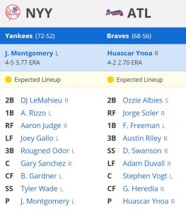 The pitching matchup features Atlanta’s Huascar Ynoa (4-2, 2.70) against New York lefty Jordan Montgomery (4-5, 3.77). New York has won 10 of its last 11 games and has a 31-11 record since July 4. The Braves have won 9 of 10 games and 16 of 18 games. Ynoa has been pitching well but he is due for some regression against this hot-hitting Yankees team. The Braves’ offense slowed down in the last 2 games facing mediocre Baltimore pitching. Ynoa is making his second start back from a three-month-long absence, so he needs a few more quality starts before he can be relied upon. Montgomery has been one of the most consistent starters in the AL. Look for the Yankee bats to stay hot while the Braves are on the verge of a cool down.