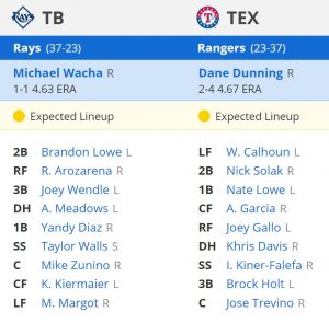 The Texas Rangers (23-37) host the Tampa Bay Rays (37-23) at Globe Life Field on Sunday at 2:35 pm EST. The Rangers took game 1 and the Rays took game 2 of the series and now they meet for the rubber match. The Rays are planning on a bullpen day starting with righty M. Wacha (1-1, 4.63 ERA, 1.17 WHIP) facing the Rangers righty D. Dunning (2-4, 4.67 ERA, 1.42 WHIP).